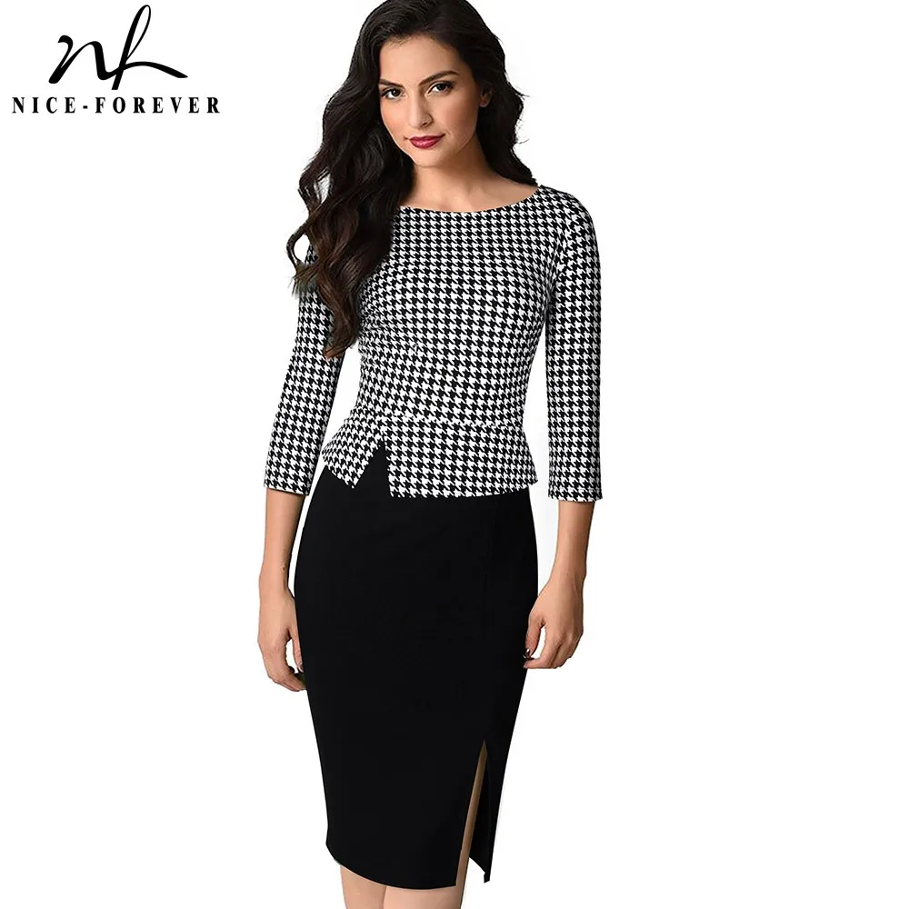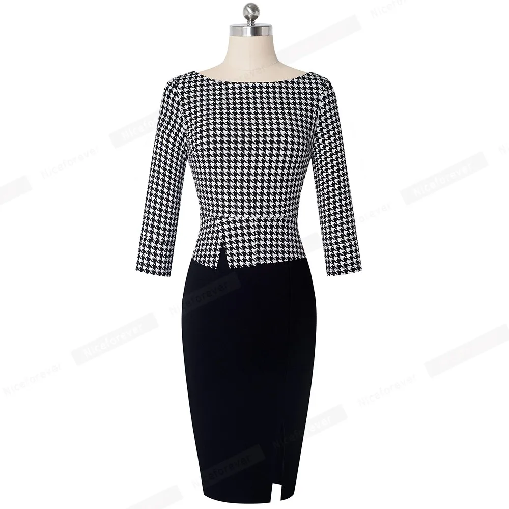 Best Seller Nice-forever Elegant Vintage Houndstooth Patchwork Office Work vestidos Business Formal Bodycon Wom