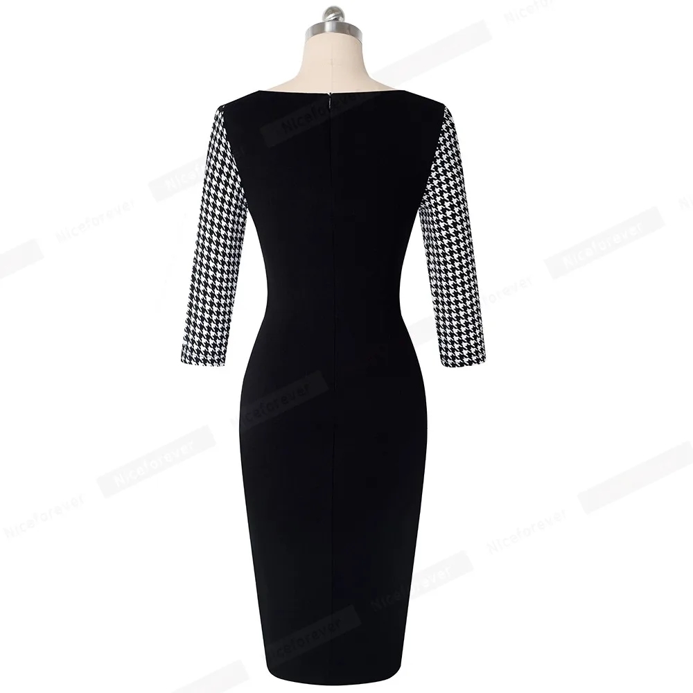Nice-forever Elegant Vintage Houndstooth Patchwork Office Work vestidos Business Formal Bodycon Wom