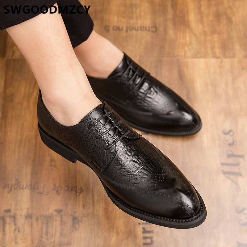 HOT SALE Crocodile Shoes Evening Dresses Formal Men Shoes Leather Pointed Brown Dress Italian Luxury Brogue
